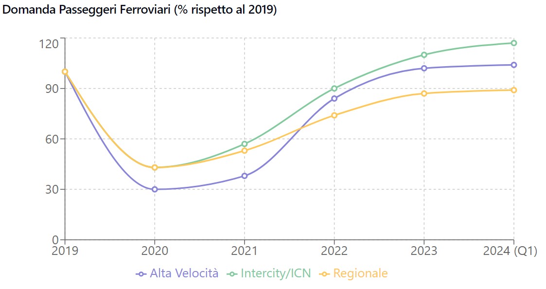 1. Il primo grafico mostra l’evoluzione della domanda passeggeri dal 2019 al primo trimestre 2024, evidenziando come i servizi Intercity/ICN abbiano registrato la ripresa più robusta, superando i livelli pre-pandemia del 17%.