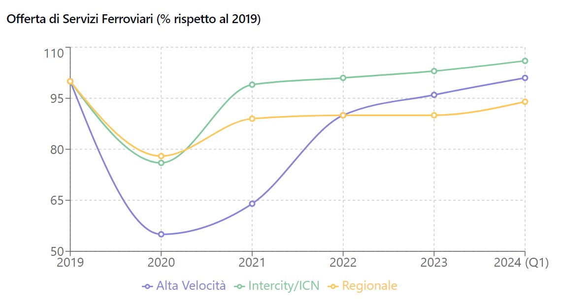 3. Il terzo grafico illustra l’andamento dell’offerta di servizi ferroviari, evidenziando come questa sia stata progressivamente adeguata alla ripresa della domanda, raggiungendo o superando i livelli del 2019 per i servizi AV e IC/ICN.